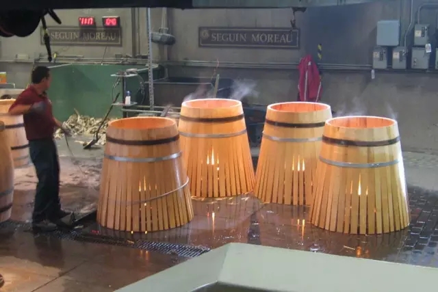 經(jīng)過烘烤的橡木條更容易彎曲成桶,此外,經(jīng)過烘烤后的橡木桶,有利于陳釀的酒液從中獲取更多的風(fēng)味。而經(jīng)過不同程度烘烤的橡木桶,會(huì)給葡萄酒帶來不同的風(fēng)味:輕度烘烤的橡木桶,桶壁的顏色改變很小,在其中陳釀的葡萄酒香氣不會(huì)受很大影響,仍是果香充沛,但能從橡木中萃取較多的單寧;中度烘烤的橡木桶,桶壁顏色變得更棕,單寧相比于前者會(huì)比較柔和,果香中還能透露出香草或咖啡的醇香;重度烘烤的橡木桶,桶壁顏色非常深,甚至已經(jīng)出現(xiàn)烤焦層,這樣酒液獲取的單寧很少,更多的是濃郁的煙熏、咖啡、豆蔻等辛香味,整體風(fēng)格是圓潤(rùn)順滑的。