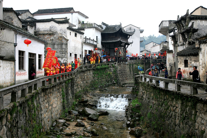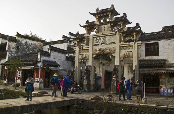 村中有祠堂、廟宇、橋梁各一百零八座;有孝子坊、貞節(jié)坊、官宦牌坊等十八座。古村老式民居鱗次櫛比,黝黑的屋瓦,淺灰的馬頭墻連成一片。大部分房子還都住人,可以像串門般地隨意進入居民家中轉(zhuǎn)悠。主人早已習慣,自管自忙活著;多有善意的笑容,但并不以特別的關(guān)注,使人更感自在親切。