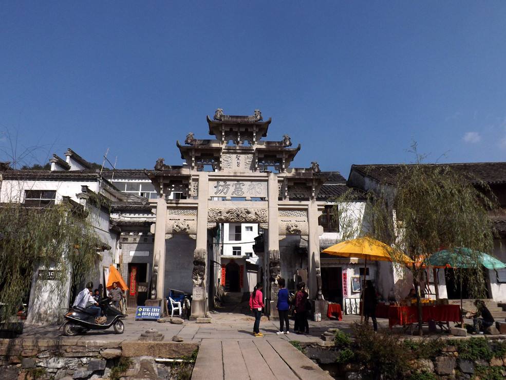 村內(nèi)古建筑百分之九十以上為明、清和民初所建,鱗次櫛比的民宅均粉墻黛瓦,古貌依舊。老村區(qū)長一公里多,寬約500米,兩頭小,中間大,形似金魚。水街有14古巷、10古橋、10古祠、5古廟、5古碾(即舊時舂米的水碓)、4古坊、2古第、1古樓。沿水街的溪中還筑有28處取水石磡。古巷縱橫交錯,羊腸百折,曲徑通幽。有的古巷從民宅樓底穿過,別具特色。三座石雕精美(多為高浮雕)的古牌坊矗立水街,令人景仰。