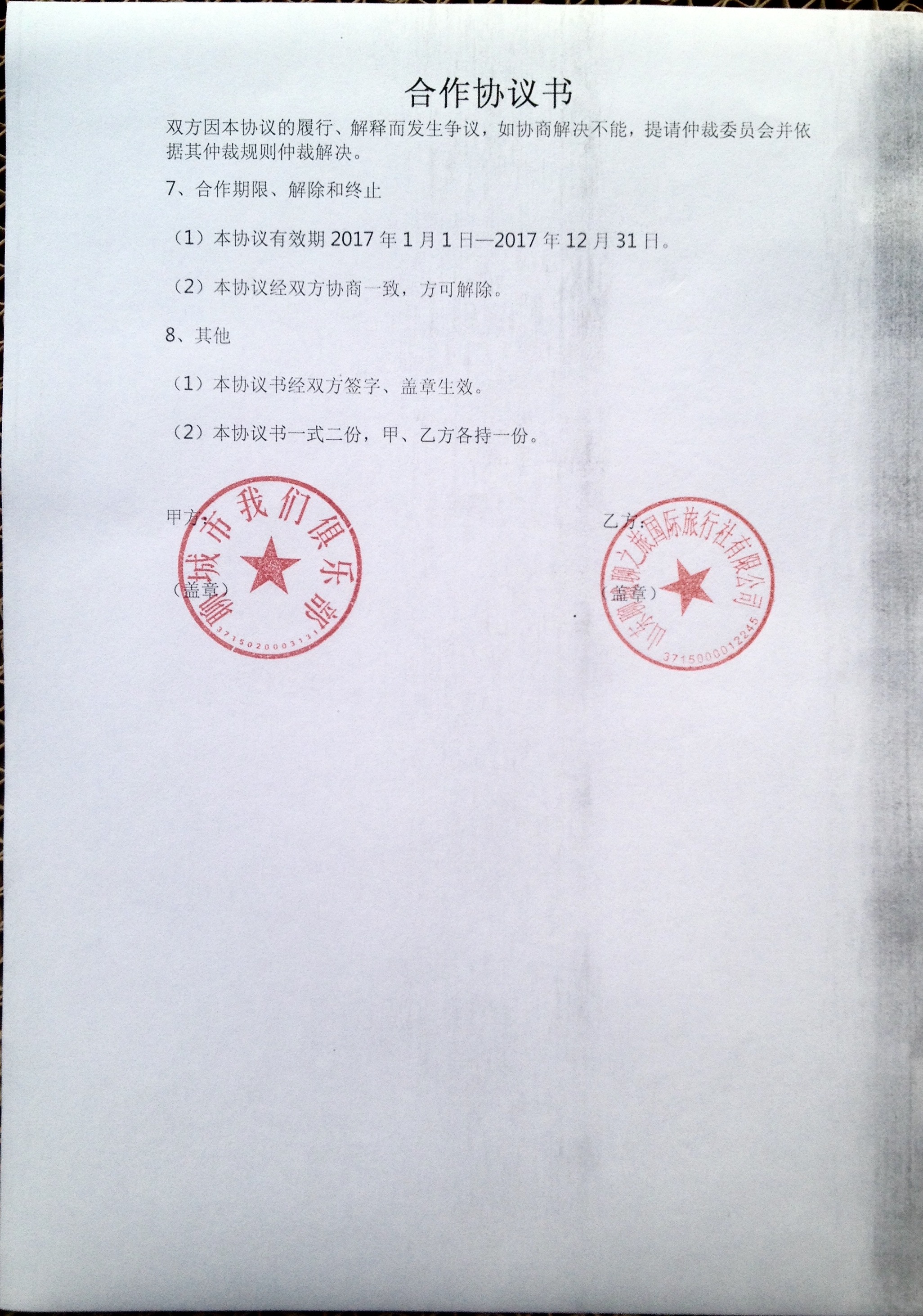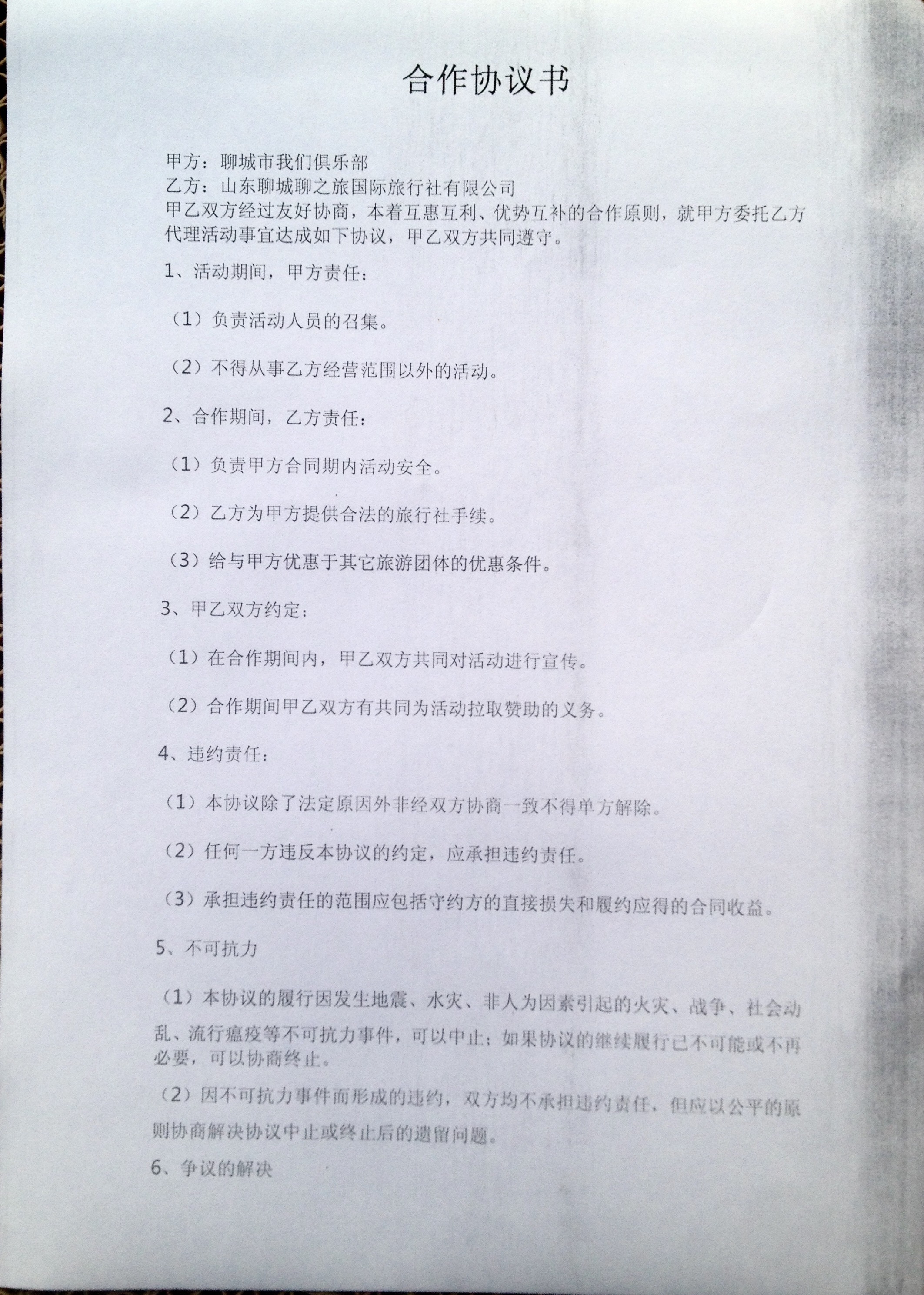 為響應(yīng)國家政策號(hào)召,我們俱樂部委托山東聊城聊之旅國際旅行社有限公司代理活動(dòng)事宜,雙方經(jīng)過友好協(xié)商,本著互惠互利、優(yōu)勢(shì)互補(bǔ)的合作原則,達(dá)成以下協(xié)議。