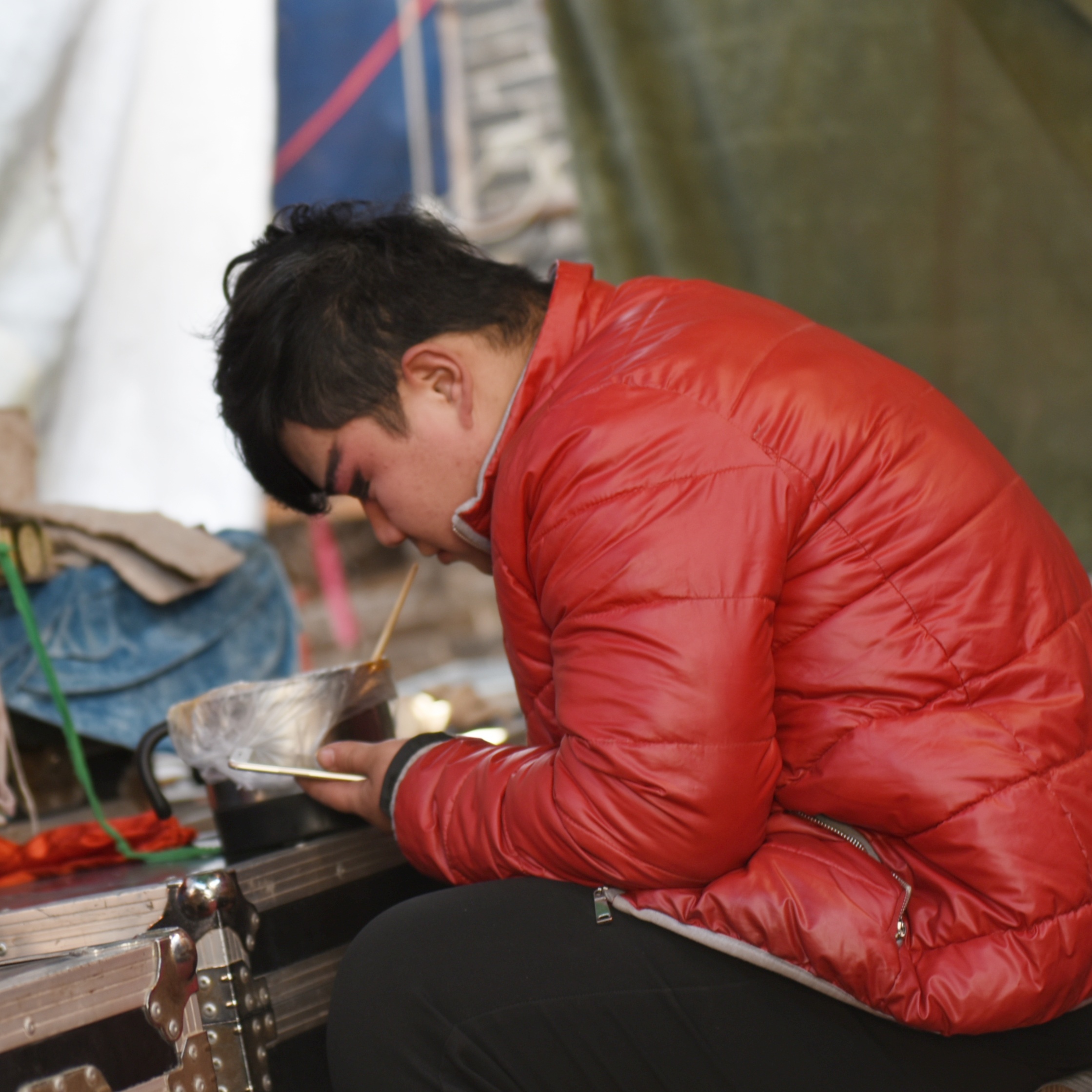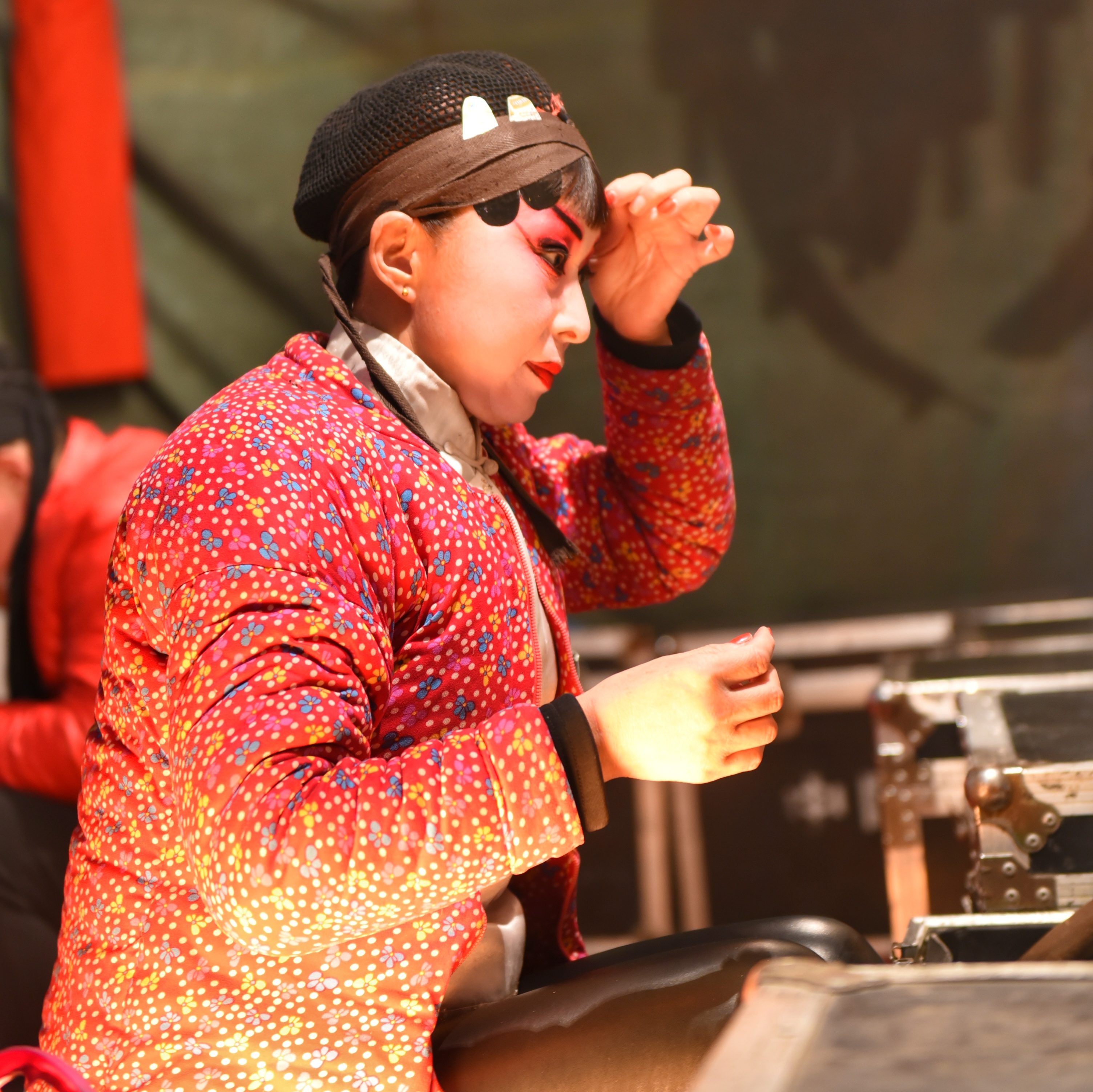 童年的記憶中我們這些頑皮的孩子,也不會依偎在父母的身旁去看、去聽自己不懂的戲曲,忙碌的后臺倒是吸引著我們的好奇心,演員的化妝、上臺前的準備、五顏綠色的戲服、一張張的大花臉,都是那么的新奇、好玩。當然此刻的我們還是那么的好奇,只是現(xiàn)在的手中多了一部單反。