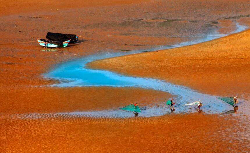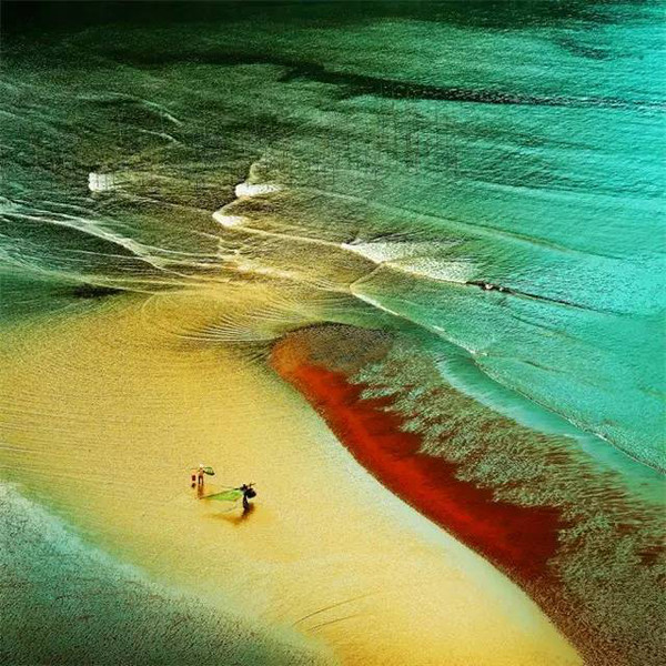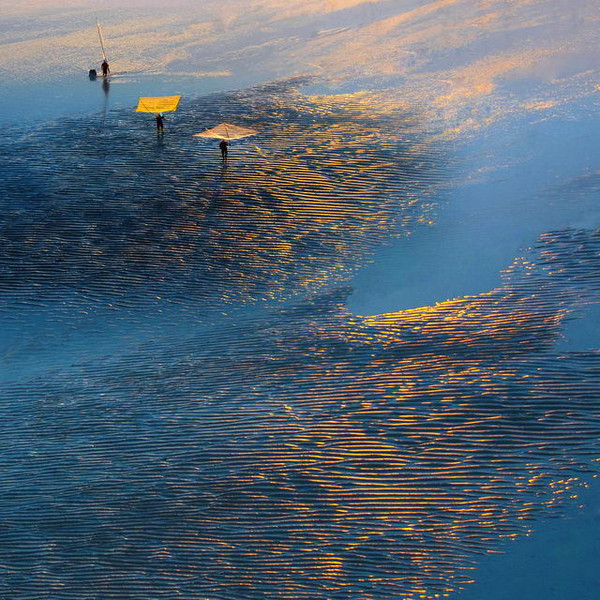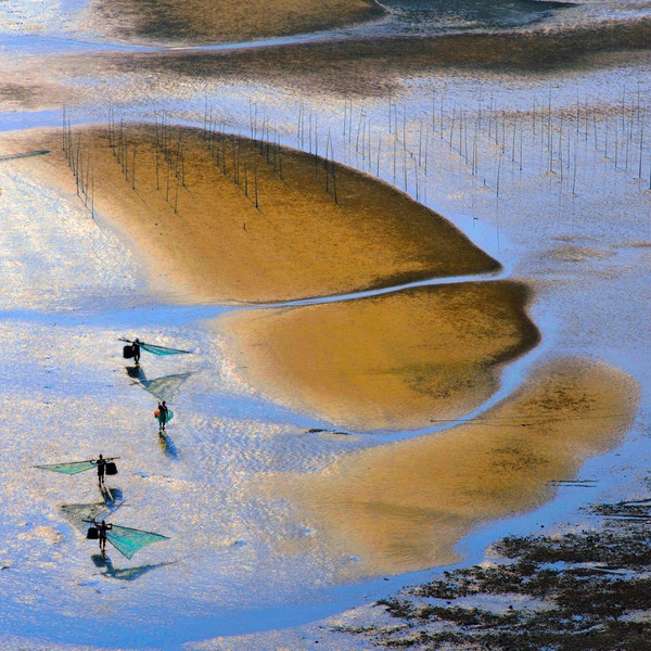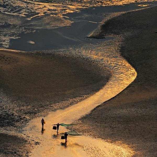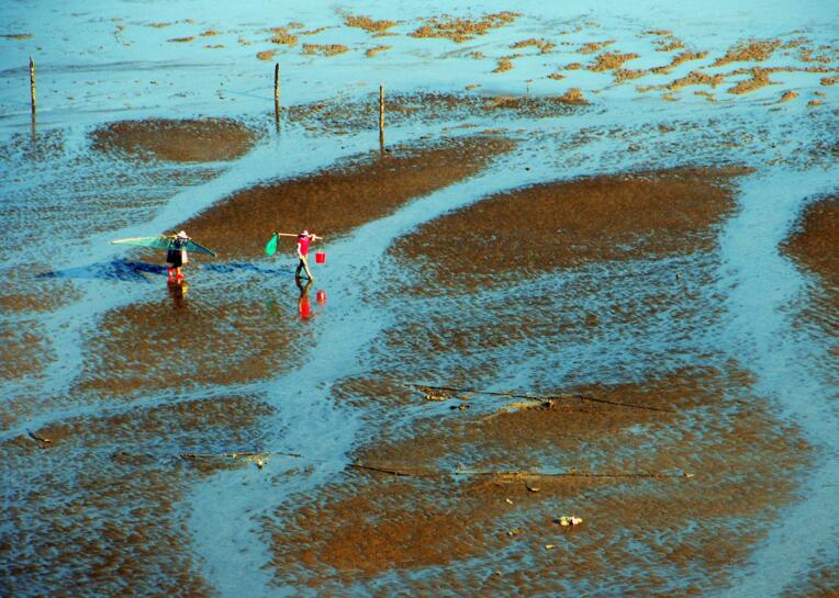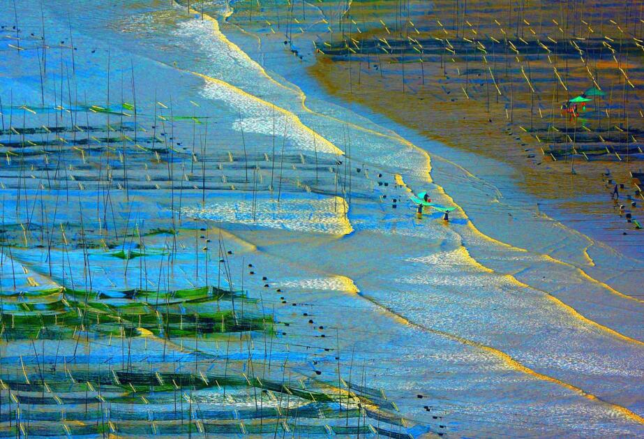第一,有人有景,營造情景交融的場景。霞浦灘涂常年都有人在勞作,點綴在灘涂上的人遠(yuǎn)處看去雖然是星星點點的,但是往往是畫龍點睛之筆。