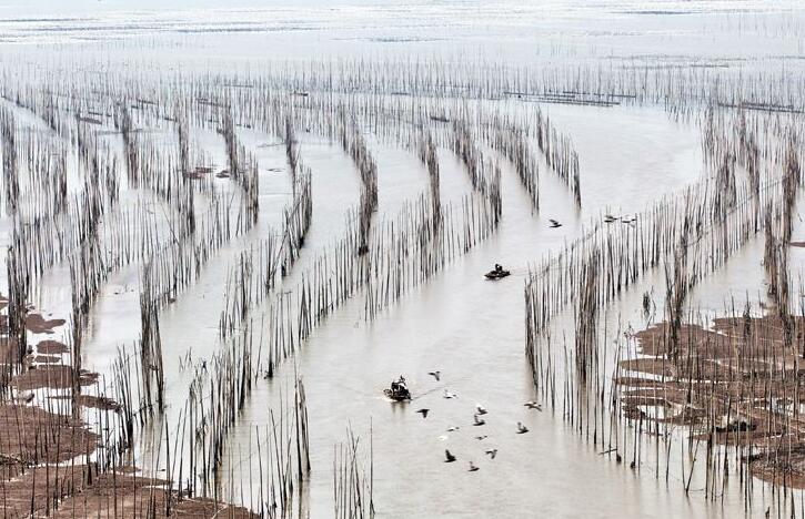 3.用好灘涂中人工種養(yǎng)的架子所形成的線條,霞浦灘涂大面積的海上養(yǎng)殖,為灘涂添加了線條和規(guī)則的幾何圖案,可以利用這些圖案組成單一節(jié)奏感很強(qiáng)的畫面。