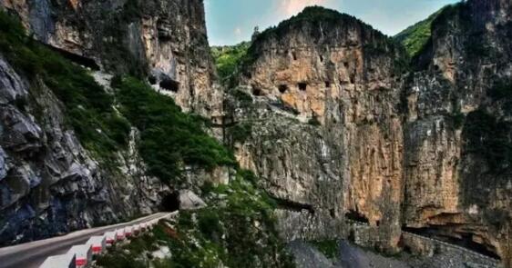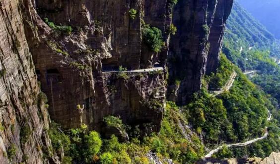 井底村著名的掛壁公路,全長1500多米長的“掛壁公路”, 39個(gè)窗口。是井底村人歷經(jīng)14年的時(shí)間,在懸崖峭壁上艱難地開鑿而成的。