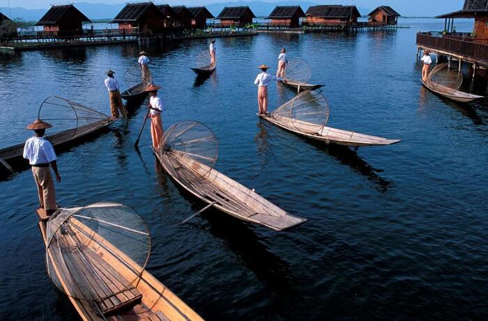 飯店內(nèi)早餐后,乘坐當(dāng)?shù)靥厣未斡[風(fēng)光旖旎的茵萊湖。茵萊湖是緬甸第二大湖,三面環(huán)山,水質(zhì)清澈,湖底水草清晰可見,湖水的顏色隨著每天日出日落而發(fā)生變化。當(dāng)?shù)匾疬_(dá)族人的村寨依湖而建,高腳屋、學(xué)校、商店等各種生活設(shè)施均佇立水中,當(dāng)?shù)厝说娘嬍称鹁泳篮煌ㄍ鶃砣揽看唬敲逼鋵?shí)的水上村寨。當(dāng)?shù)厝颂赜械膭澊绞绞钦驹诖玻帜_并用的劃船。乘船參觀坐落在湖上的【水中佛塔】,在此可以欣賞俗稱【貓?zhí)?/strong>】的【波道烏寺】中的緬甸貓?jiān)谒轮猩说挠?xùn)練下,可以為游人表演鉆圈,寺中的五世佛像是艷麗湖的至尊,寺中的佛塔金光燦燦,全寺全部由柚木建成,木雕技藝精湛,其本身就是一座藝術(shù)寶庫;參觀水上【手工織布制衣作坊】、【卷煙作坊】、【鐵器生產(chǎn)作坊】,與【長頸族家庭】拍照,參觀當(dāng)?shù)孛恐芤淮蔚募小?strong>水上市場】,領(lǐng)略緬甸獨(dú)特的水上村寨生活。午餐在風(fēng)光奇美的【水上餐廳】用餐,品嘗湖中的特產(chǎn)魚。晚入住水邊的木屋別墅。