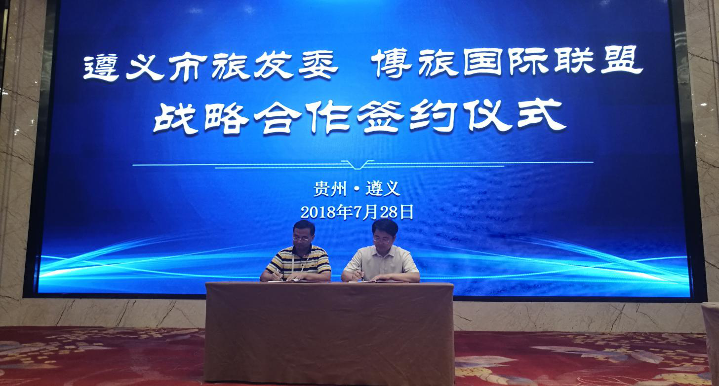 遵義市旅發(fā)委主任令狐紹輝(右)與博盟會長李厚忠代表雙方簽訂戰(zhàn)略合作協(xié)議