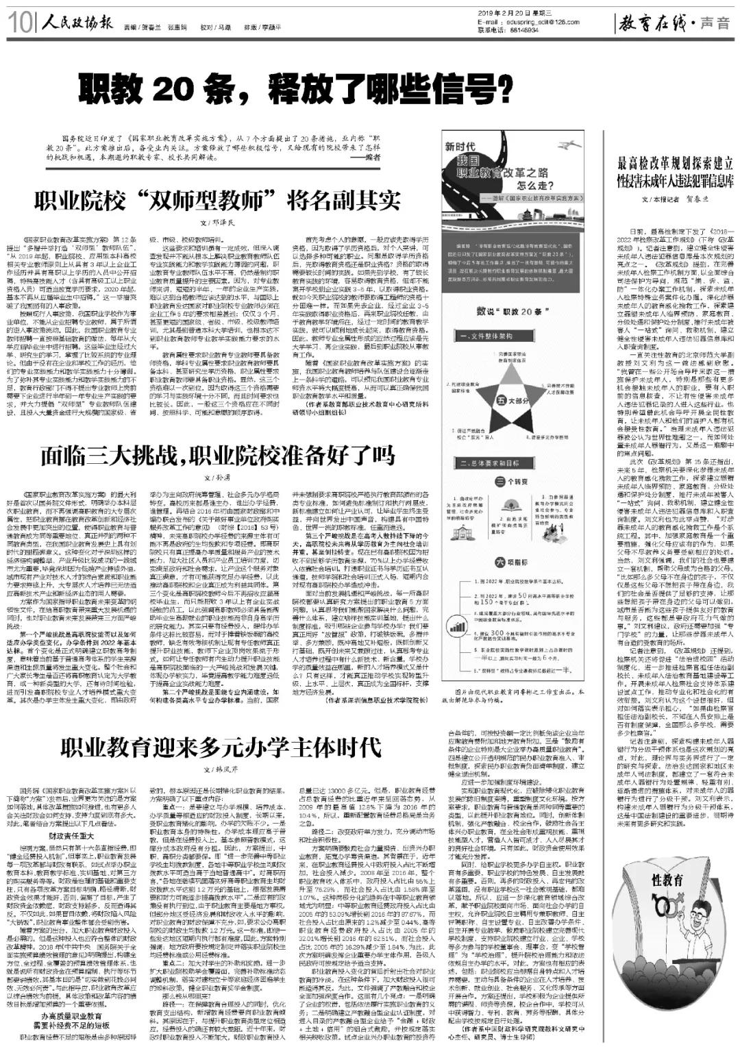 面對(duì)當(dāng)前發(fā)展機(jī)遇和嚴(yán)峻挑戰(zhàn),每一所高職院校都要認(rèn)真研究方案提出的職業(yè)教育5方面問題,認(rèn)真思考我們能幫國家解決什么問題,完善什么體系,建立啥樣技能實(shí)訓(xùn)基地,提出什么制度標(biāo)準(zhǔn),吸引哪些企業(yè)參與學(xué)校辦學(xué)?我們要真正用好“放管服”政策,打破鐵飯碗,多措并舉、多方兼顧,既沖高地又補(bǔ)短板,既抓創(chuàng)新又打基礎(chǔ),既開創(chuàng)未來又兼顧過往,認(rèn)真思考專業(yè)人才培養(yǎng)過程中有什么新技術(shù)、新含量,學(xué)校辦學(xué)的質(zhì)量效益在哪里,新的人才培養(yǎng)模式又是什么?只有這樣,才能真正推動(dòng)學(xué)校實(shí)現(xiàn)轉(zhuǎn)型升級(jí),上水平、上層次,真正成為全國標(biāo)桿,支撐地方經(jīng)濟(jì)發(fā)展。(作者系深圳信息職業(yè)技術(shù)學(xué)院院長)