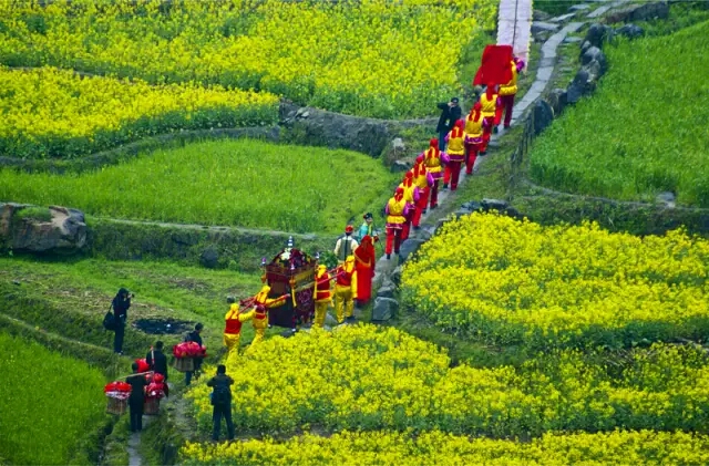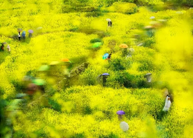 緩緩向四周蔓延的梯田油菜花