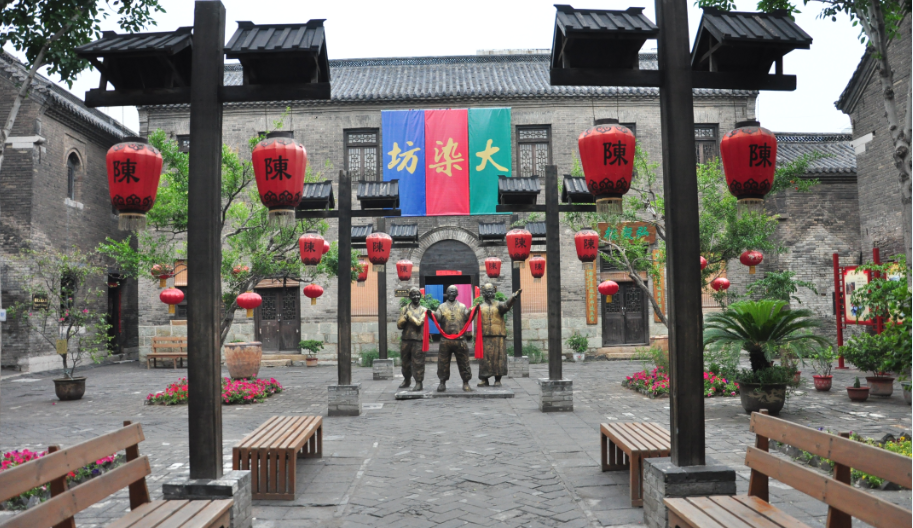 【大染坊】清道光年間東來升綢布莊的舊址,典型的前店后廠的格局,保存完好的建筑迄今已有近200年的歷史,現(xiàn)保存完好的兩進院落展示了清末染坊的繁榮盛景。2002年,熱播的電視劇《大染坊》故事的發(fā)生地就在這里。陳壽亭在周村創(chuàng)業(yè)的場景在這里再現(xiàn)。該劇著名編劇陳杰先生為家鄉(xiāng)再度創(chuàng)作并在此拍攝了電視連續(xù)劇《旱碼頭》。陳杰先生英年早逝,陳杰紀念館坐落于院內(nèi),在這里可以伴隨先生共同聆聽《大染坊》、《旱碼頭》的故事。