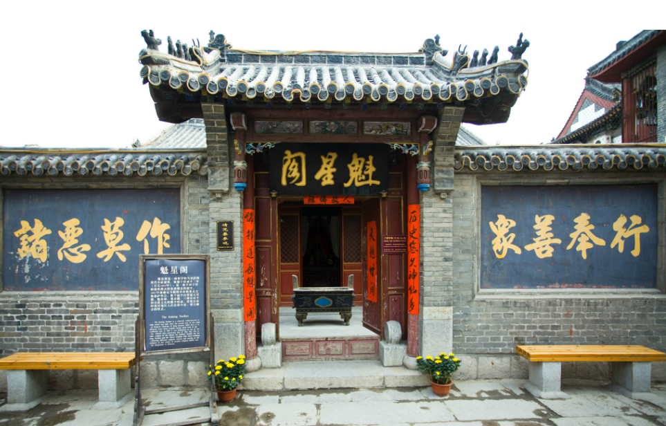 【魁星閣廟群】位于銀子市街南首,是周村現(xiàn)存最完整的寺廟古建筑群之一。由三座不同宗教文化的廟宇組成,有道教的碧霞元君殿、佛教的觀音殿、儒教的魁星閣,道儒佛三教共處一地。無論是來自五湖四海的商人,還是方圓百里的父老鄉(xiāng)親,無論是求平安,求富貴,求早得貴子,還是求金榜題名,都可以在這里得到精神寄托。因此,百余年來香火一直十分旺盛。