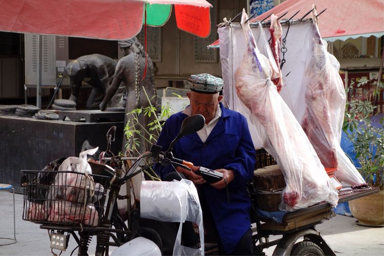 賣(mài)羊肉的流動(dòng)攤販。當(dāng)?shù)氐难蛉鈨r(jià)格和我們家鄉(xiāng)差不多,30多元一斤,不過(guò)都是帶著骨頭的,好大好肥的羊肉耶。導(dǎo)游是濟(jì)南人,他每次回家探親都買(mǎi)很多的羊肉用保鮮箱發(fā)回家。