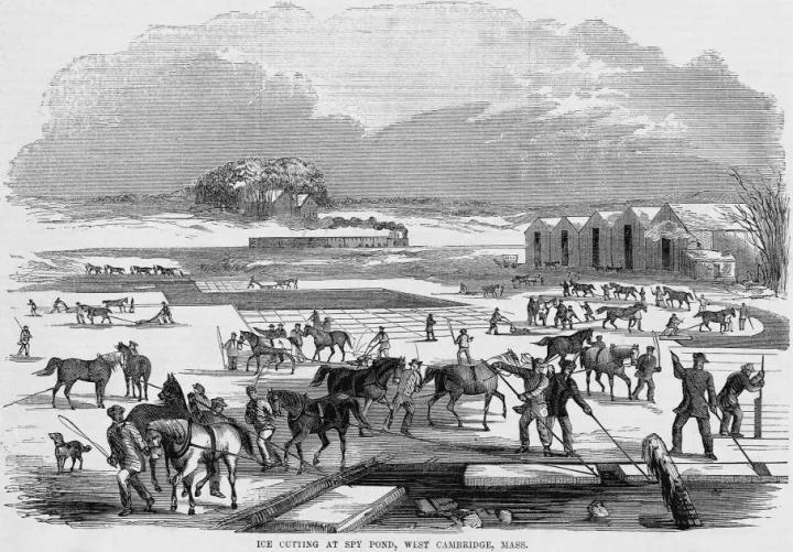 Spy Pond, Arlington 開采河冰的場(chǎng)景。都鐸的手下發(fā)明了一種用馬拉著的鐵質(zhì)刀具切割河冰。