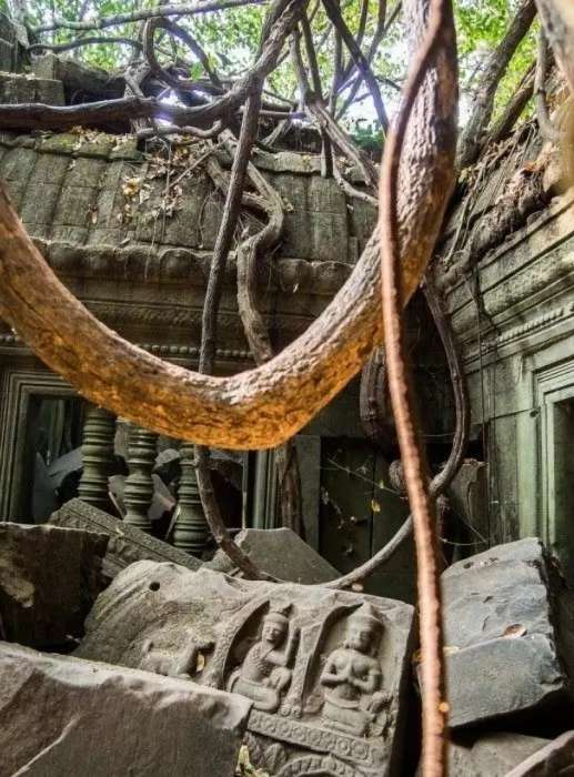 崩密列是吳哥窟公認(rèn)最神秘的寺廟,崩密列的歷史還處于不明狀態(tài),據(jù)學(xué)者推測(cè)大約建造于 11 世紀(jì)末至 12 世紀(jì)初,宮崎駿電影《天空之城》的原型,古寺搭配樹木、青苔、落葉建構(gòu)出唯美的意象。整個(gè)寺廟嚴(yán)重崩塌,石頭落了一地沒有任何保護(hù),感覺人人都可以撿走,被叢林層層覆蓋千年,各種被封死的的門,似乎里面隱藏著大秘密。