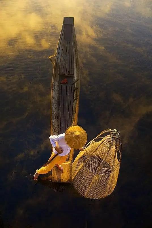 夕陽西下,頭戴斗笠的漁民,一手拿捕魚的簍子,一手拿著船槳,準(zhǔn)備上岸回家吃晚飯。