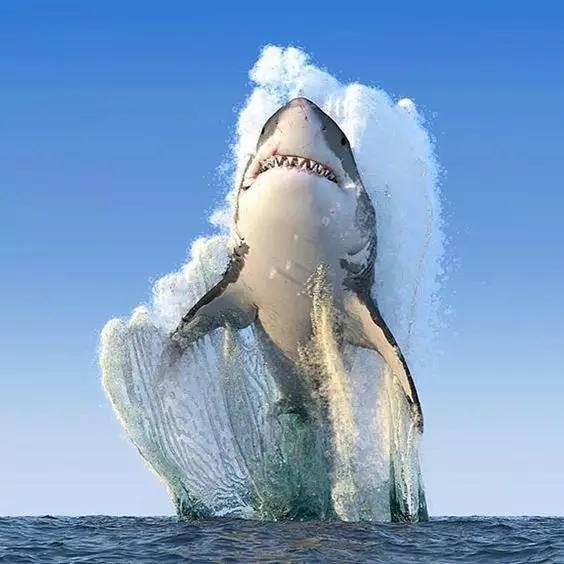 大白鯊從海里一躍而起,身體激起巨大的浪花,這樣的鯊魚看上去一點(diǎn)都不可怕反而很可愛。