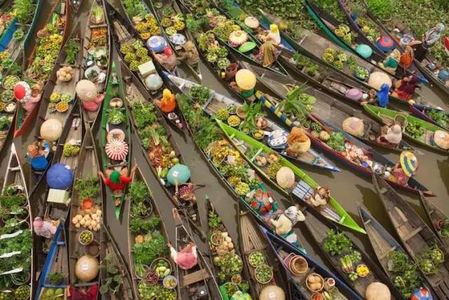 在泰國,菜市場不在地上而在水中,各種新鮮的水果和蔬菜被放在一條條狹窄瘦長的小木船上進(jìn)行售賣。顧客買東西很有意思:要從這條船上跨到另外一條船上。