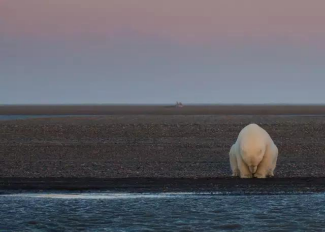 因?yàn)槿驓夂蜃兣┤诨恢槐睒O熊孤獨(dú)地蹲在岸邊,無家可歸。