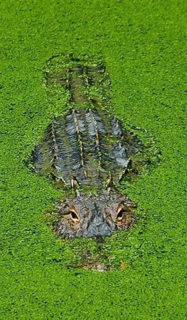 躲在綠色的海藻中,只漏出眼睛和背部的鱷魚正全神貫注等待自己獵物的到來。