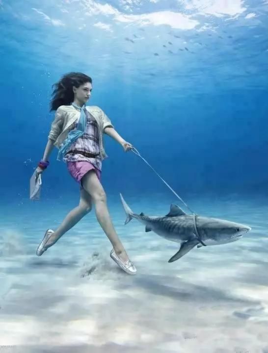 一位衣著時(shí)尚的美女,左手牽著鯊魚,右手拿著包包,這種海底逛街的方式真的太潮了!