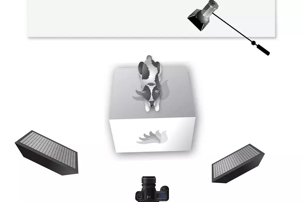 攝影師Mark C Hughes分享,他在攝影棚內(nèi)拍攝動物時經(jīng)常采取的打燈方式——總共使用三個柔光箱(Softbox)、兩盞主光(Key light)分別從被攝物前方兩側(cè)45度角打光,再于后上方是只一盞發(fā)光(Hair Light)以點亮輪廓。這樣的配置能均勻照亮鏡頭前的主角,并使其與身后的背景分離開來。