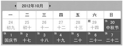 【網(wǎng)宣部】因?yàn)橹星锕?jié)和國慶節(jié)合并,時(shí)隔三年后中國將迎來1999年節(jié)假日制度改革以來第二個(gè)8日長假。昨天,北京市政府辦公廳發(fā)布了《2012年中秋節(jié)、國慶節(jié)放假安排通知》。9月30日(星期日,中秋節(jié))至10月7日(星期日)放假調(diào)休,共8天,而9月29日(星期六)則要上班。