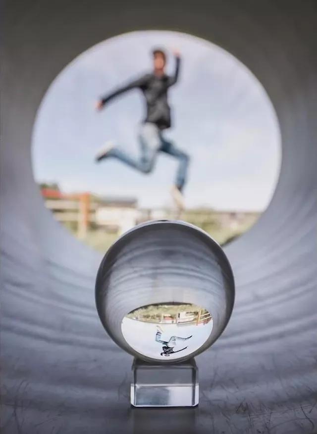 和其它需要大光圈虛化背景的玩法不同,這一玩法需要使用小光圈,讓整個(gè)畫面都清晰,使球內(nèi)倒錯(cuò)的線條、圖案和現(xiàn)實(shí)場(chǎng)景中圖案對(duì)應(yīng)起來(lái)。