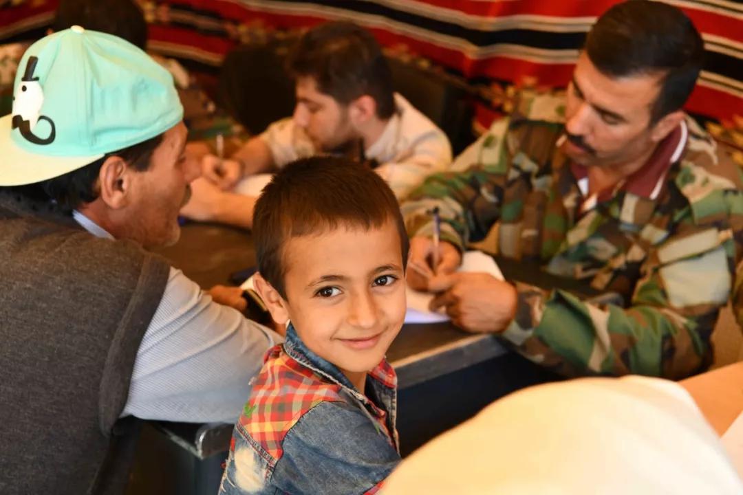 2018 年6月28日,在敘利亞首都大馬士革北部加拉蒙山區(qū)的杰拉吉爾鎮(zhèn)前的過境點,返鄉(xiāng)難民辦理簡單的登記、核驗手續(xù)。