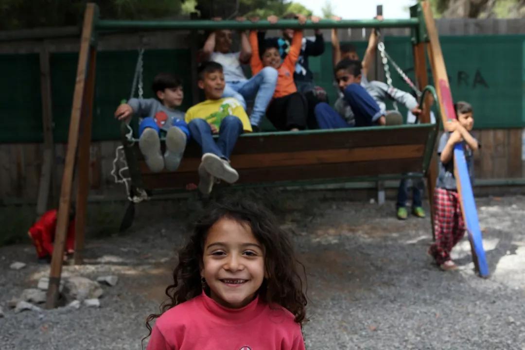 2018 年4 月12日,在希臘雅典以北約 86 公里處的里措納難民營,兒童在秋千上玩耍。歐盟委員會主管移民、內(nèi)部事務與公民事務的委員阿夫拉莫普洛斯 12 日在視察雅典附近一座難民營時表示,歐盟將繼續(xù)幫助希臘、意大利等處于難民問題前沿的國家。