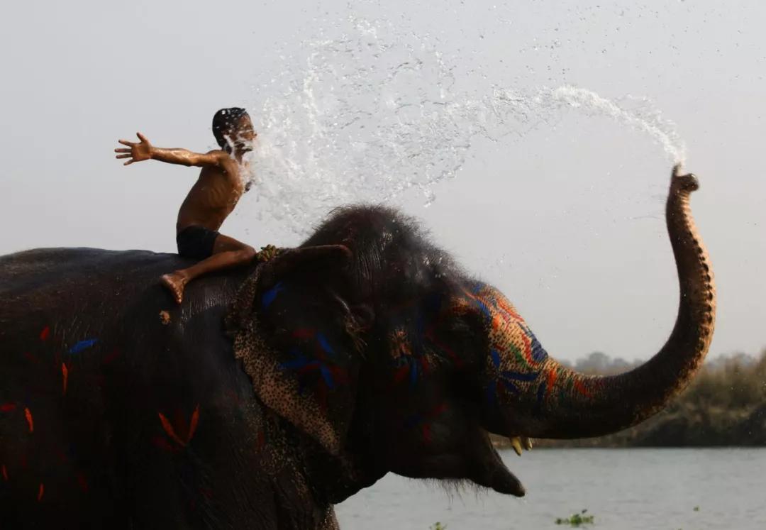 2018 年12月27日,在尼泊爾奇特旺,一名兒童在大象節(jié)上和大象戲水。第十五屆尼泊爾大象節(jié)正在奇特旺的索拉哈鎮(zhèn)舉行,活動旨在推廣當?shù)芈糜螛I(yè)并增強人們對野生動物的保護意識。