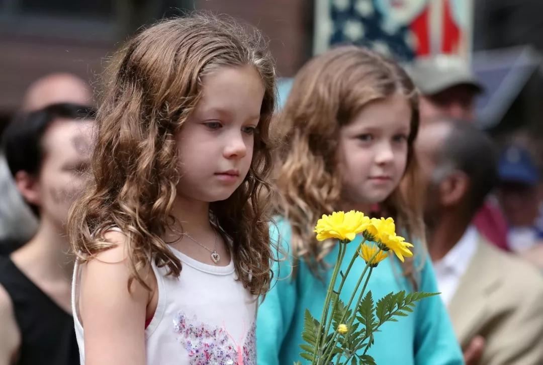 2017 年8月13日,在美國芝加哥,一名小女孩手持鮮花參加紀念活動。數(shù)百名芝加哥市民13日聚集在市中心的聯(lián)邦廣場,為美國弗吉尼亞州夏洛茨維爾市暴力事件受害者舉行紀念活動。