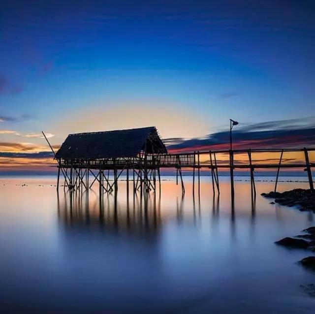 將水平線、地平線放在畫面的正中間,這種構(gòu)圖方式在風(fēng)光攝影中雖然不常見,但也會(huì)使用。比如,攝影師想要突出位于湖面上的小亭子,而小亭子又正好擁有一段很長(zhǎng)的長(zhǎng)廊。我們就可以將這段長(zhǎng)廊作為一條水平線來(lái)構(gòu)圖。