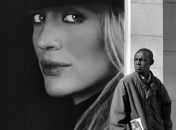 突出被攝主題的一個有效方法是讓它的尺寸看起來不太一樣,上面這張照片巨幅廣告里的女主角比實際生活中的男主角要大的多,對比起來,那個在角落里的黑人男性是那么卑微。