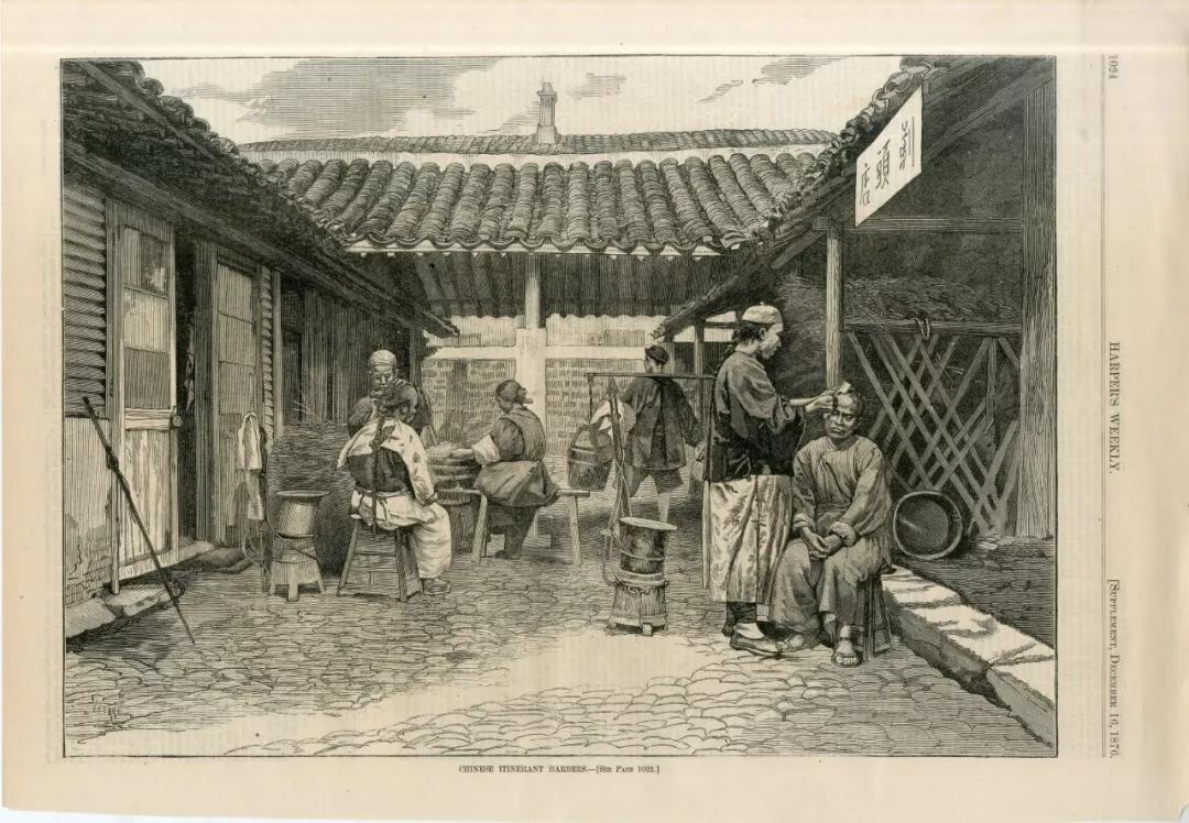 威廉·桑德斯作品《上海理發(fā)店》,攝影版畫/蛋白照片,30×41 厘米,1876,原作由 Laura Huang 收藏