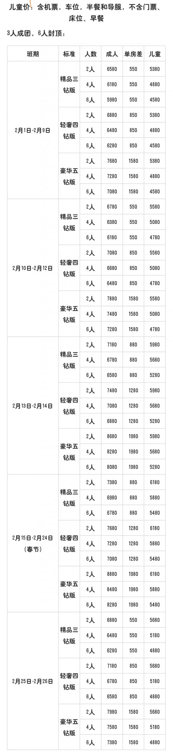 成人 ¥8880 /人, 兒童 ¥6180 /人