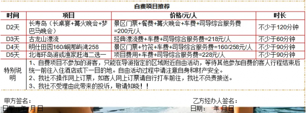 1.乙方特別提醒甲方,乙方所推薦的另行付費(fèi)旅游項(xiàng)目,不一定適合所有旅游者參加。請(qǐng)甲方根據(jù)自身情況以及需求, 在“自愿自費(fèi)”的前提下選擇參加,乙方不得以任何理由強(qiáng)迫甲方參加。