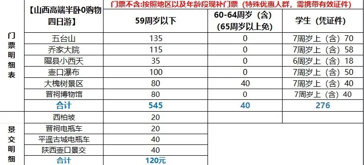 2、陜西壺口100元/人(60周歲以上免)+景交40元;