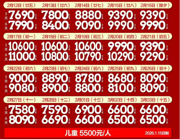 成人 ¥11000 /人, 兒童 ¥5500 /人