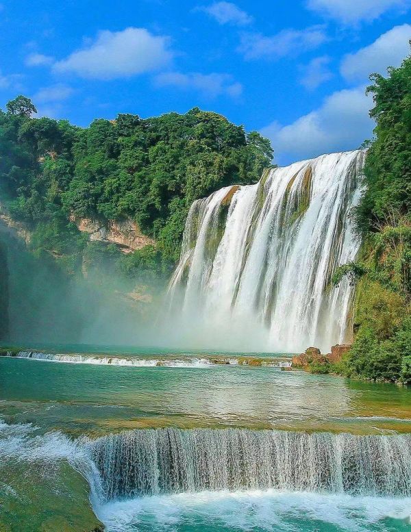 瀑勢(shì)如山倒,吼聲狀雷,頗為壯觀。瀑布騰空噴瀉,橫向墜落,同響水河縱向錯(cuò)落的68級(jí)瀑布松成一幅絕妙的立體交叉瀑布群景觀。瀑在路側(cè),人在瀑下,倍覺(jué)暢酣和親切。瀑布濺噴的水霧飄飄灑灑,紛紛揚(yáng)揚(yáng),給游客以撲面涼爽和美的享受。