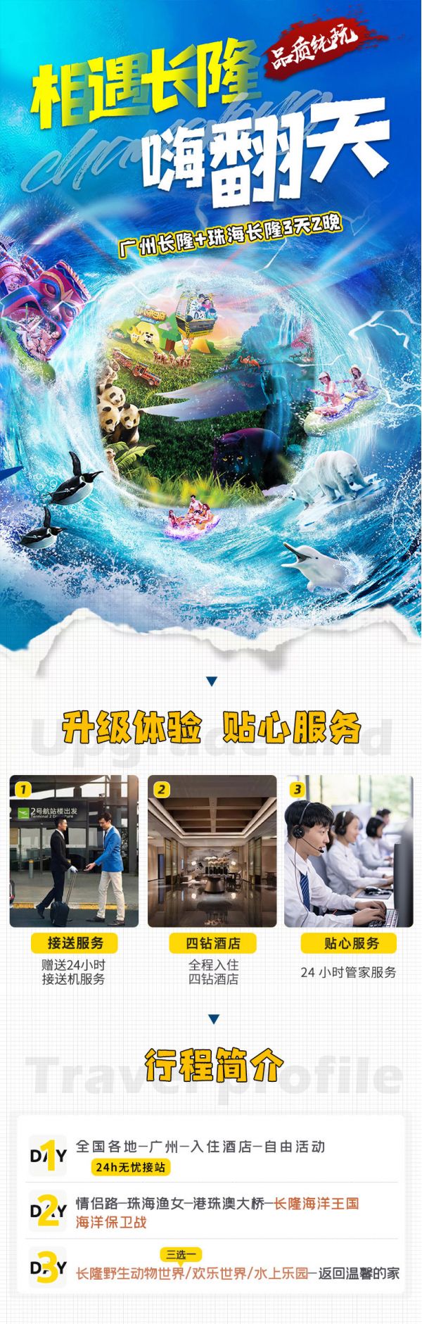 門票及地面項目:行程中所列景點/場館首道大門票珠海長隆海洋王國,廣州長隆動物世界/歡樂世界/水上樂園(三選一)因景區(qū)/場館標準不一樣,兒童價不含景區(qū)/場館門票費用,如產(chǎn)生兒童門票費用,游客可自行到景區(qū)/場館購買門票或由服務人員代為購買。