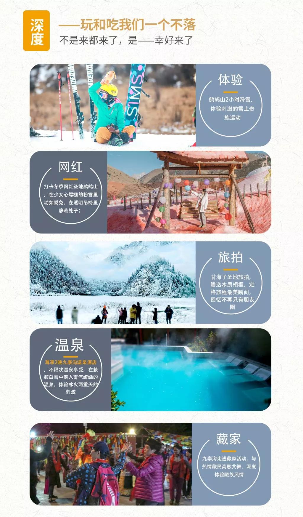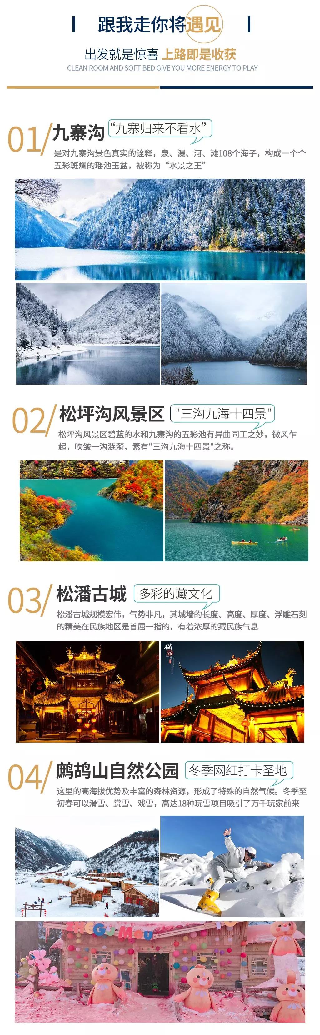 當日行程:九寨溝得名于溝內(nèi)有九個藏族村寨,以“九寨六絕”——翠湖、疊瀑、彩林、雪峰、藏情、藍冰而聞名天下。遠望雪峰林立,白雪皚皚;近看碧水澄澈,清可見底;除卻如夢似幻的自然景觀,還有藏家木樓、晾架經(jīng)幡、棧橋、磨房、藏族習俗及神話傳說構(gòu)成的人文景觀,也因這不二的美,你能在這里見到許多熱門影視劇里的取景場地。冬季的九寨溝變得尤為寧靜,也更具詩情畫意,山巒與樹林銀裝素裹,瀑布變成了一幅幅巨大的天然藝術(shù)冰雕如此潔白而高雅的世界,錯開擁擠的游人,卻能收獲一個觀賞九寨六絕之“藍冰”和“雪峰”的最好時機。