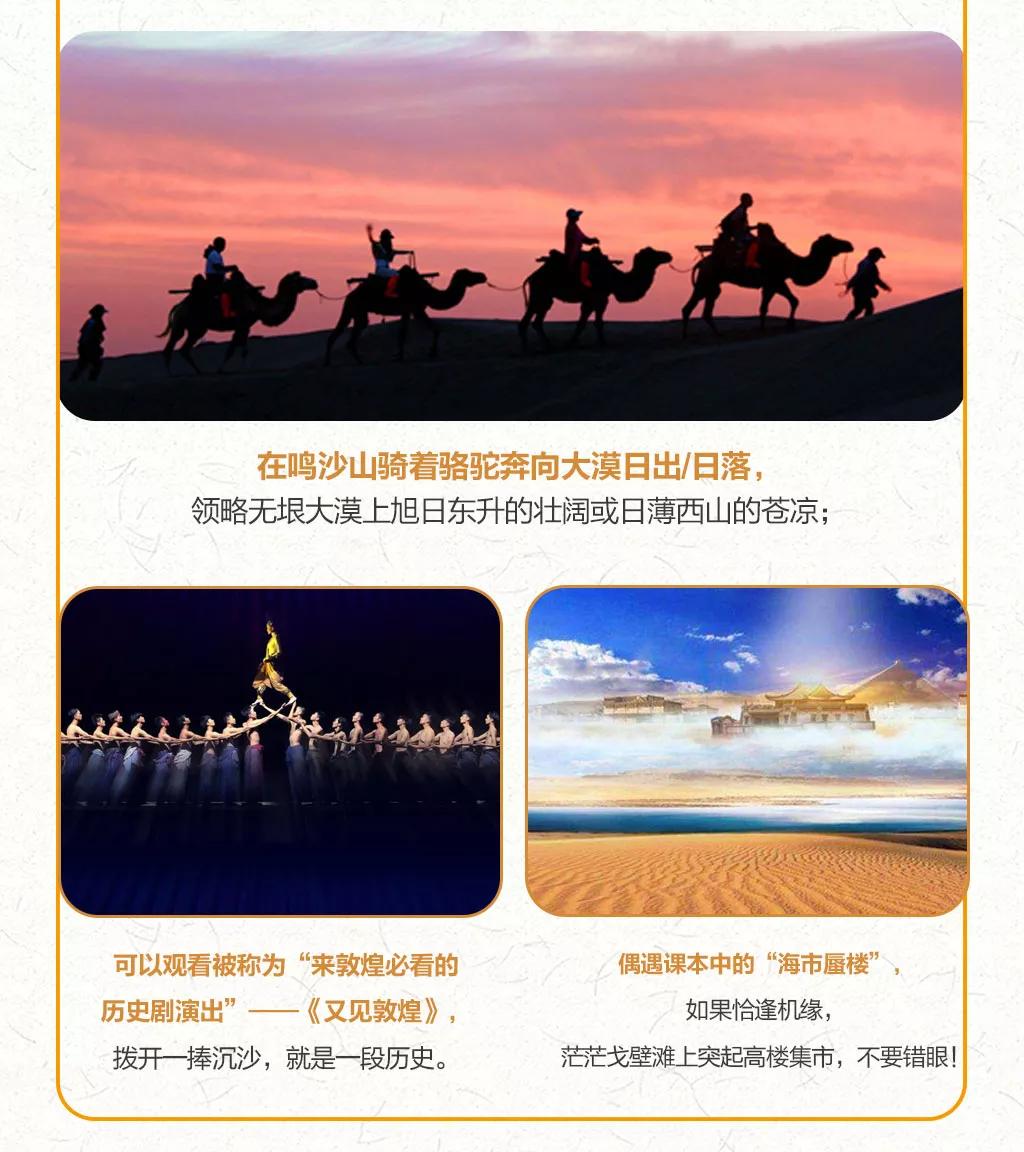 西北地區(qū)天氣干燥,旅途的過程中請大家多喝水,注意防曬;敦煌《又見敦煌》演出,旅游淡季298元/人,旺季368元/人起;果木烤全羊費用根據羊的大小決定,由參與活動的游客均攤,一般10人一桌,人均消費160元左右。