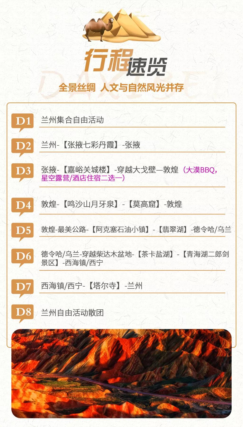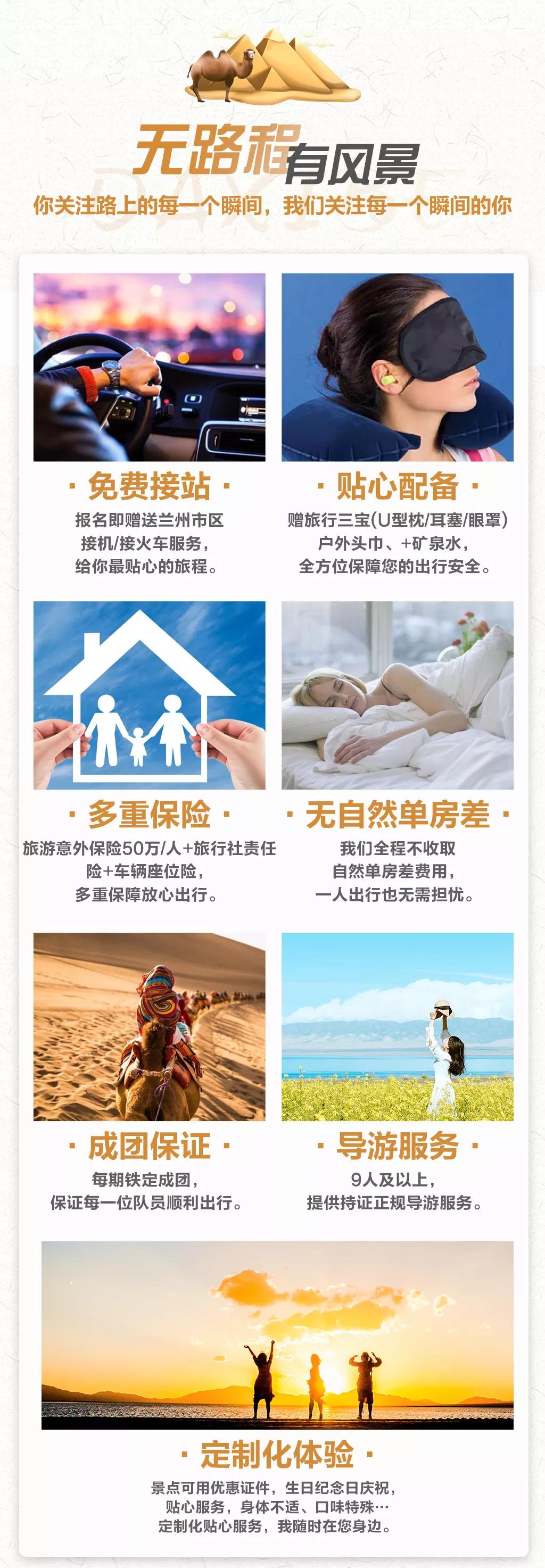 贈送:贈送特色敦煌沙漠BBQ;特贈獨家定制許愿瓶禮盒,許你獨家記憶;贈送貼心禮包旅游三寶、魔術頭巾、礦泉水;贈送蘭州市區(qū)接機/接火車服務,23點后由于運管規(guī)定不能接機/接站,敬請諒解。(贈送項目不用費用不退)