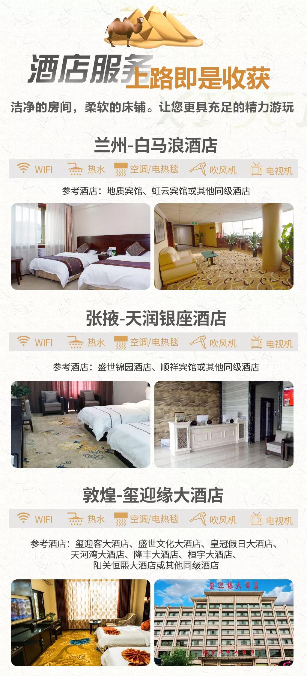 敦煌:璽迎緣大酒店、璽迎客大酒店、盛世文化大酒店、皇冠假日大酒店、天河灣大酒店、隆豐大酒店、桓宇大酒店、陽關恒熙大酒店或其他同級酒店