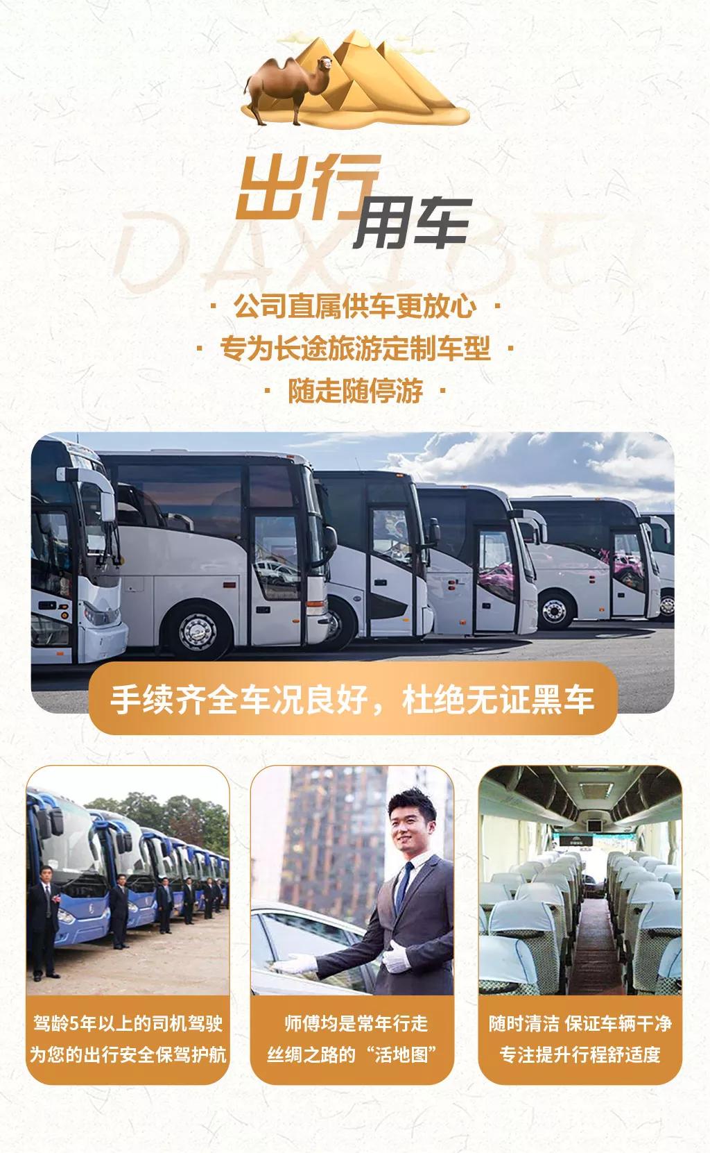 交通:全程正規(guī)空調旅游車出行,保證一人一正座位,車型大小根據實際人數安排,且由駕駛經驗豐富的司機為您的出行保駕護航,報價包含車費、油費、停車費、維修費及司機勞務費。