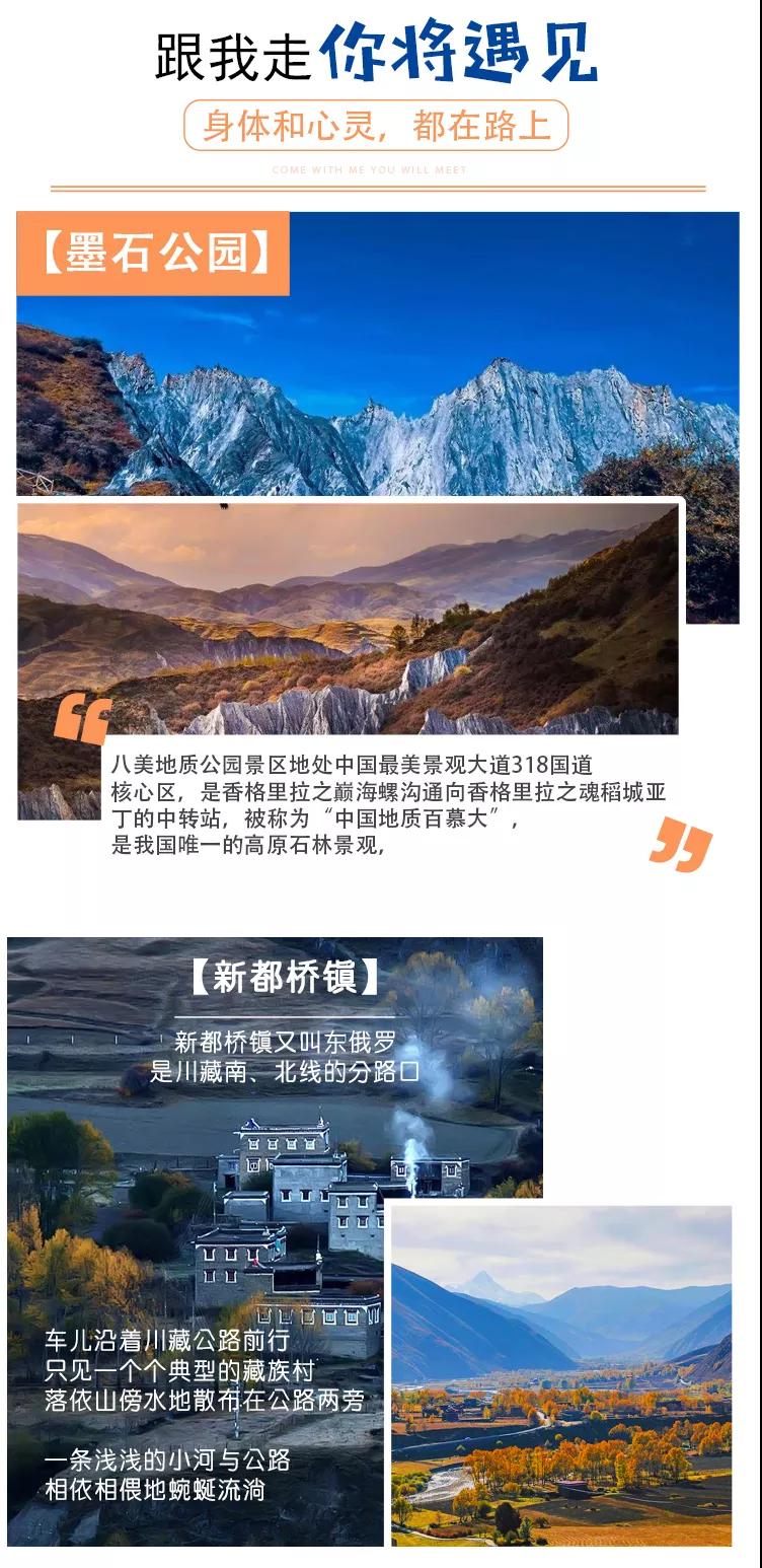 如果時間尚早,大家還可以去自由游覽【新都橋】這一令人神往的“攝影天堂”,神奇的光線,無垠的草原,彎彎的小溪,金黃的柏楊,山巒連綿起伏,藏寨散落其間,牛羊安詳?shù)爻圆荨ㄎ鞯钠皆L光美麗地綻放。