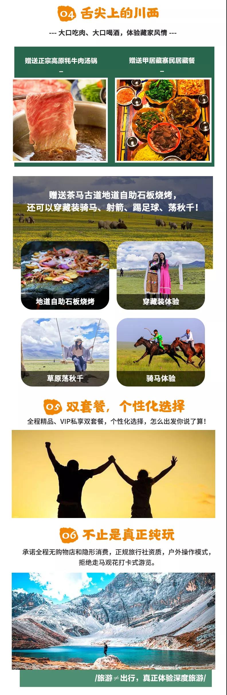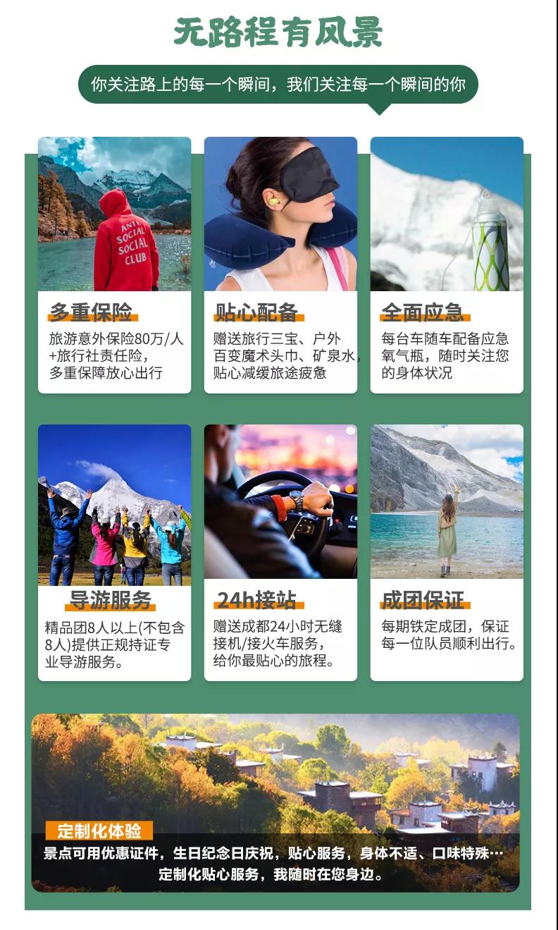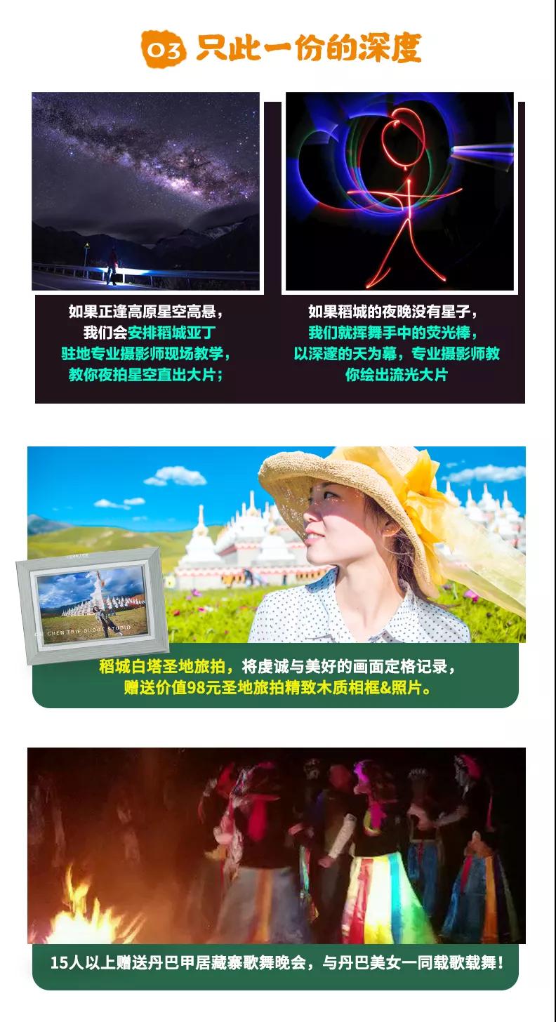 贈(zèng)送:特色贈(zèng)送甲居藏寨藏家晚餐、高原特色牦牛湯鍋、理塘茶馬古道自助石板燒烤;贈(zèng)送旅游三寶、魔術(shù)頭巾、礦泉水緩解旅途疲勞;贈(zèng)送價(jià)值98元圣地旅拍精致木質(zhì)相框&照片;贈(zèng)送稻城專(zhuān)業(yè)攝影師現(xiàn)場(chǎng)教學(xué)夜拍星空直出大片,沒(méi)有星星時(shí)則教拍流光大片;15人以上贈(zèng)送甲居藏寨篝火晚會(huì);贈(zèng)送成都市區(qū)24小時(shí)接機(jī)/接火車(chē)服務(wù);贈(zèng)送項(xiàng)目不用不退。