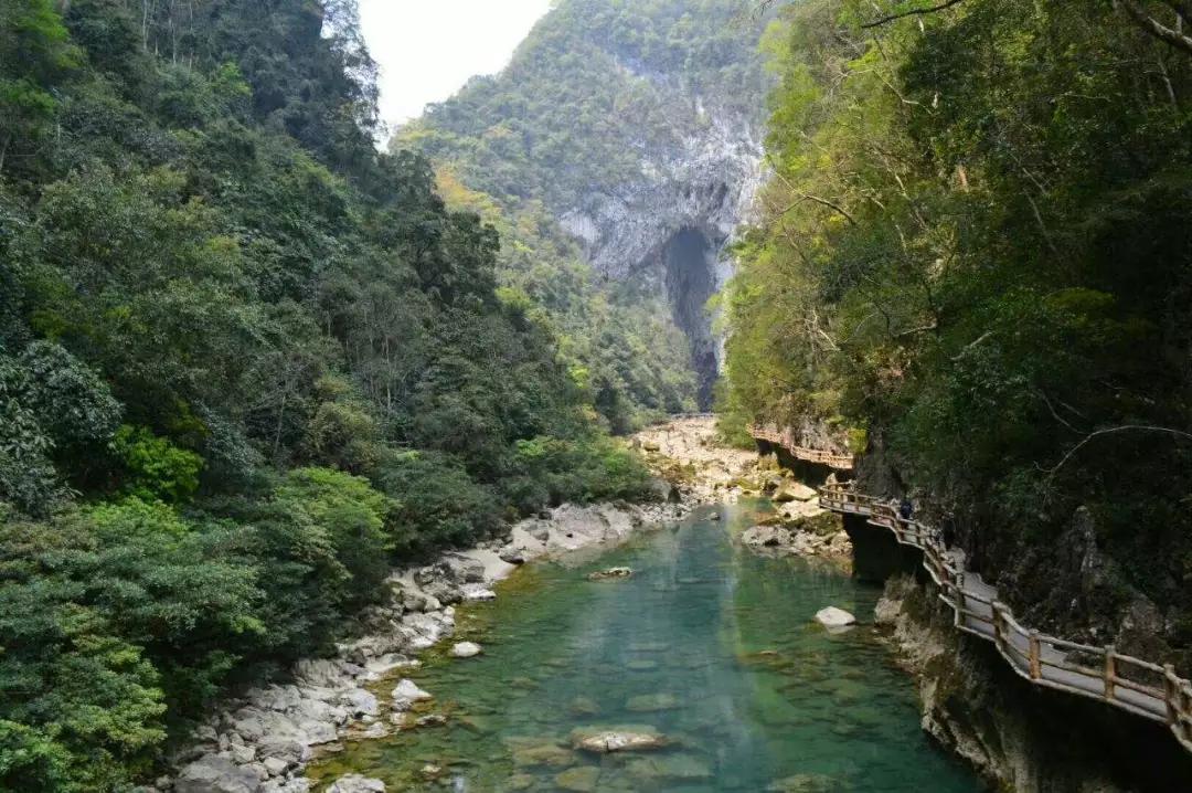 下午:后乘車前往游覽國家AAAAA級景區(qū)【大七孔】(游玩時間不少于2小時);大七孔是以原始森林、峽谷、伏流、地下湖為主體的景區(qū),沿著恐怖峽打狗河直下,可見吊橋,右邊的棧道一面靠山,一邊臨水,蜿蜒曲折,凹凸不平。最為震撼的還是走過棧道的三分之二處,有一橫跨河兩岸的天然巨巖,是喀斯特是貌奇觀之一,俗稱天生橋,被專家們譽(yù)為“大自然神力所塑的東方凱旋門”,仰觀橋孔下,只見巨型鐘乳懸掛,橋腳、橋側(cè)的裂隙石縫長出綠石草叢灌木,藤蘿花卉纏裹橋身,真是滿目琳瑯、五顏六色的天然大彩橋。