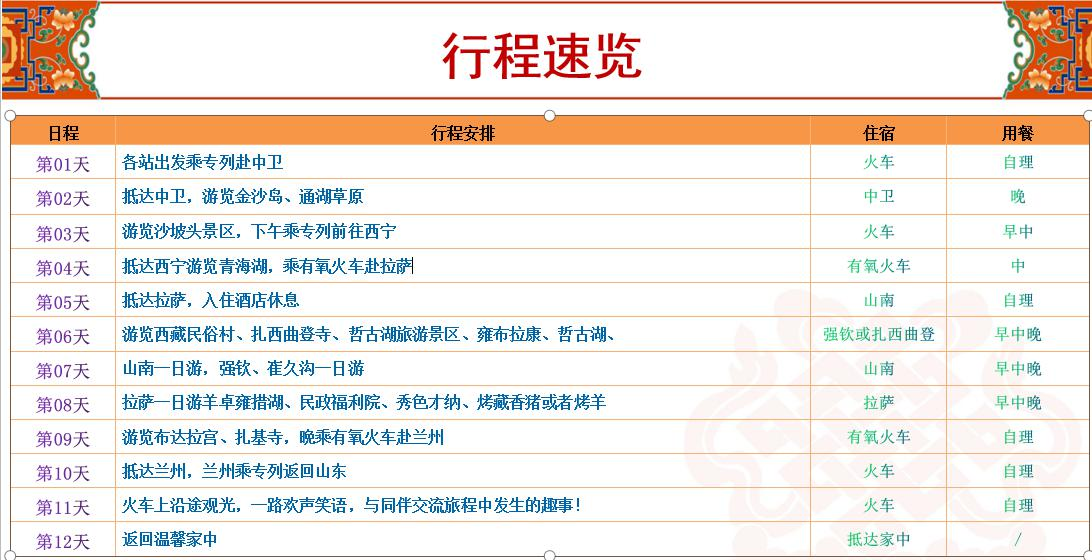3、交通:往返火車臥鋪,當(dāng)?shù)芈糜诬嚕WC每人每正座,因特殊氣候條件,旅游車輛均無(wú)空調(diào)設(shè)施。