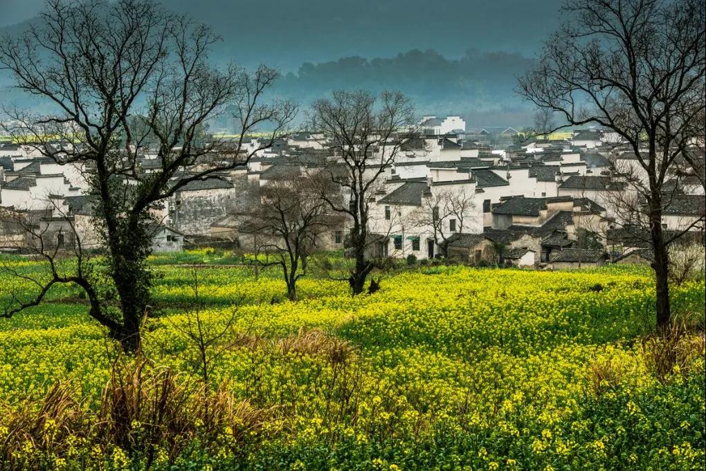 春天來(lái)臨時(shí),漫天金黃的油菜花將水墨色的徽派建筑照耀著,白墻青瓦反射著微黃色的光,細(xì)看之下,還有幾枝桃花點(diǎn)綴其中。村里裊裊炊煙一直飄到了青色的山上,與山上的煙霧糾纏在一起。這大概才是徽州真正的模樣。