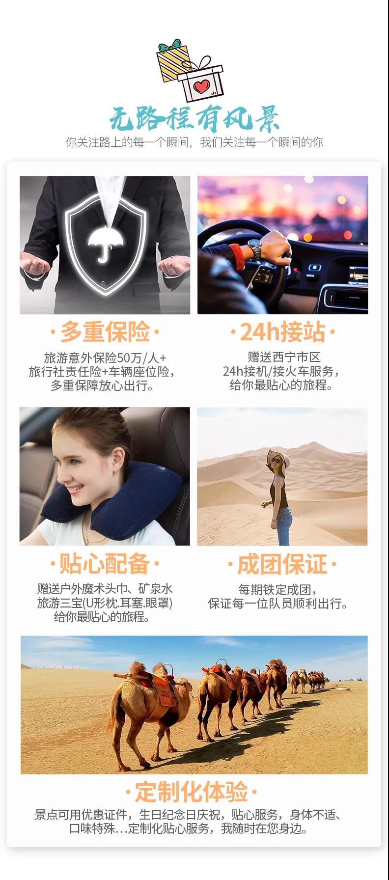 贈送 :贈送戶外魔術(shù)頭巾、旅游三寶(頸枕耳塞眼罩)、礦泉水;贈送西寧市區(qū)24小時接機/接火車服務(wù)。(贈送項目不用費用不退)